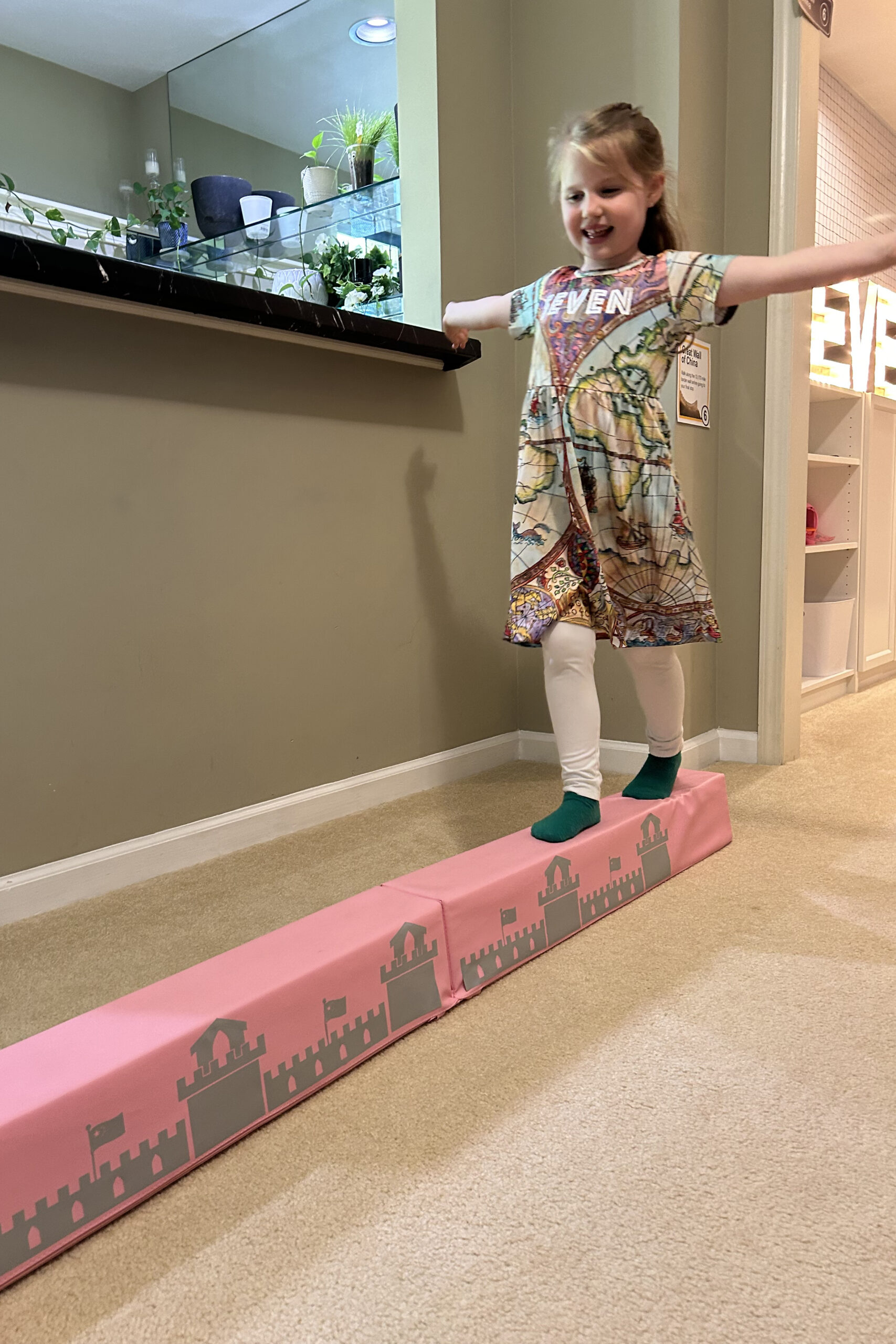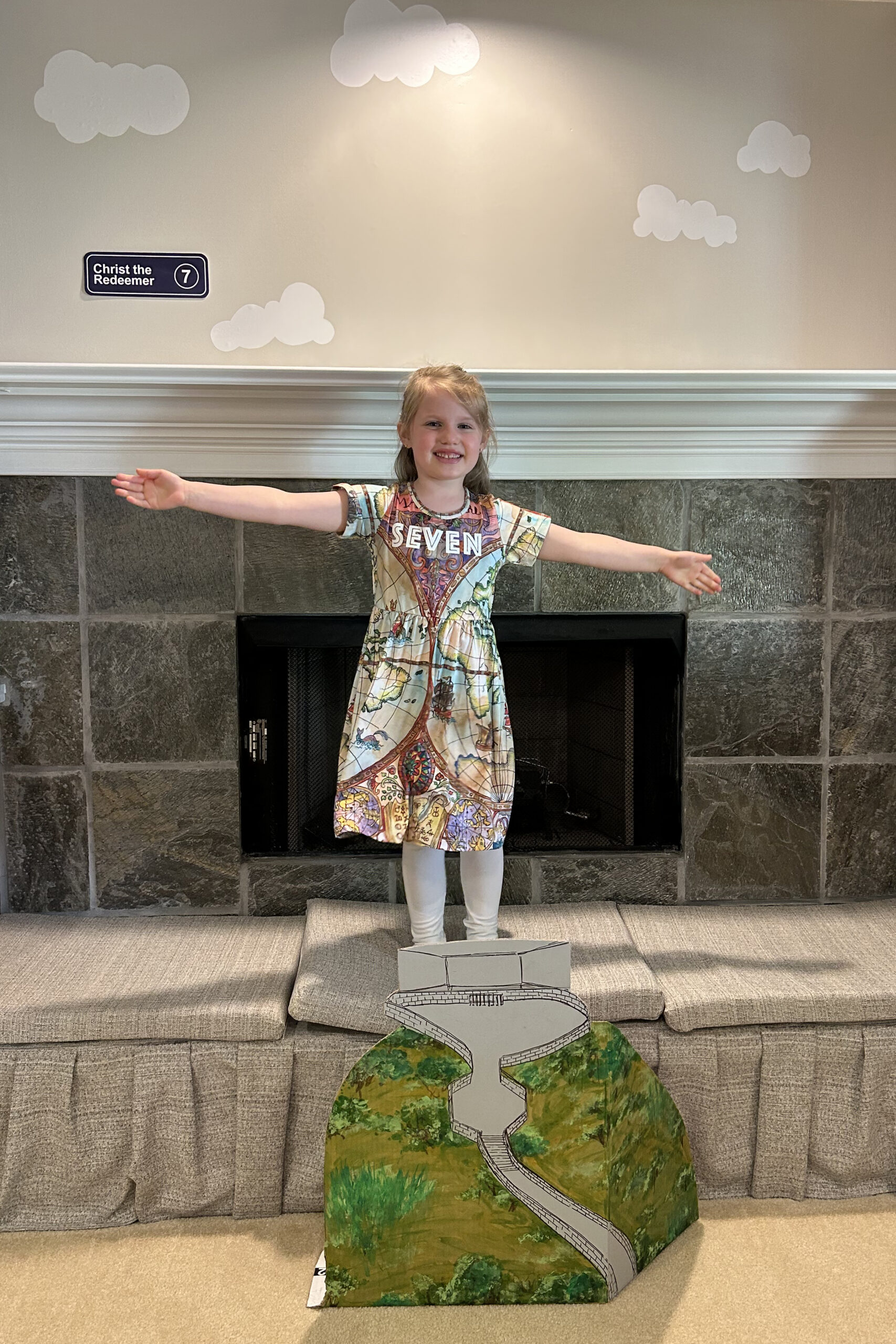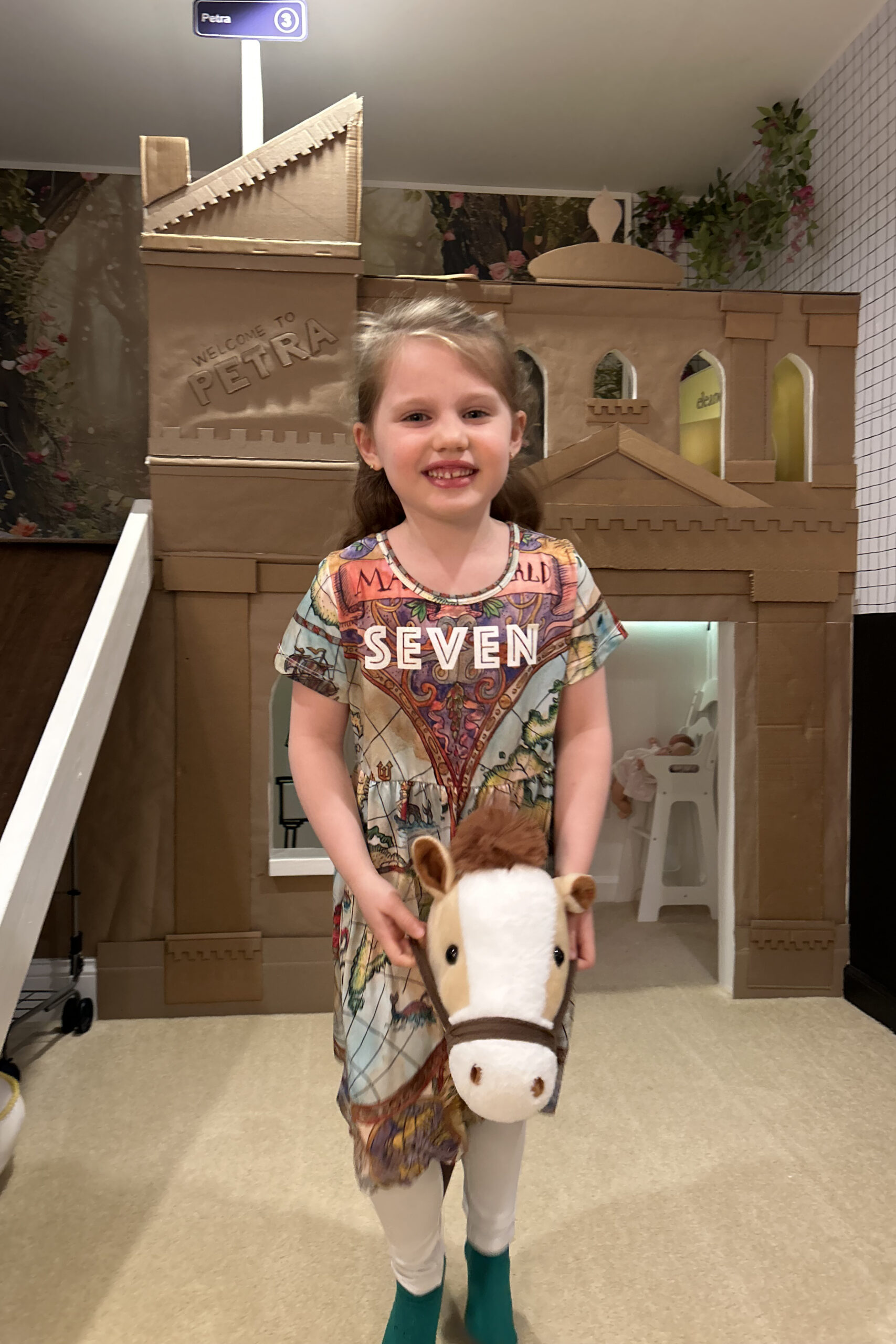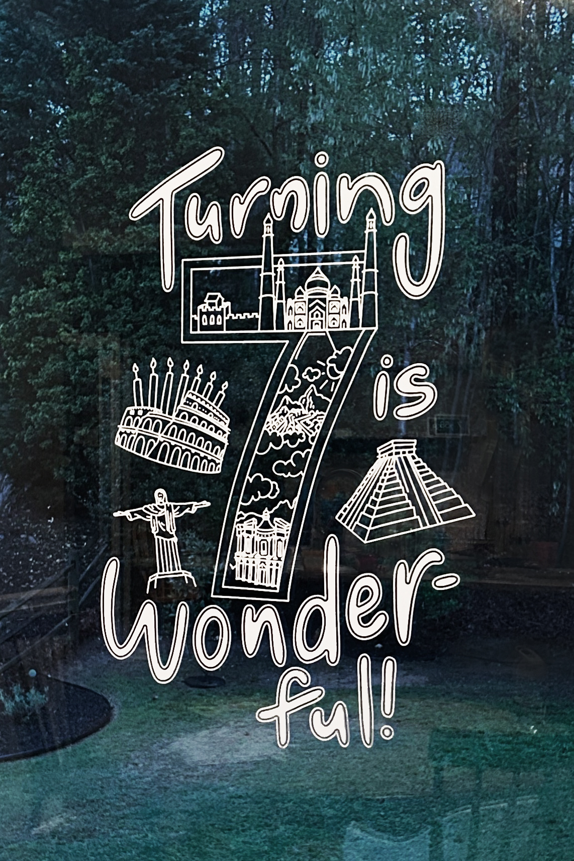 I don’t think as a 6-going-on-7 year old I even knew what the seven wonders of the world were but when Ellie mentioned this being a good theme for her seventh birthday I was fully on board. We worked together to come up with an obstical course around the basement with events for each wonder and decided that the invitations should look like passports. Mama’s design skills were then put to good use to create the most realistic looking passport with ticket and all the information needed. I also made a large window sticker with the phrase “Turning 7 is wonderful” and illustrated all of the seven wonders into it. Her invites were talked about at school for months and she is still to this day referred to by one teacher as the “8th wonder of the world”!